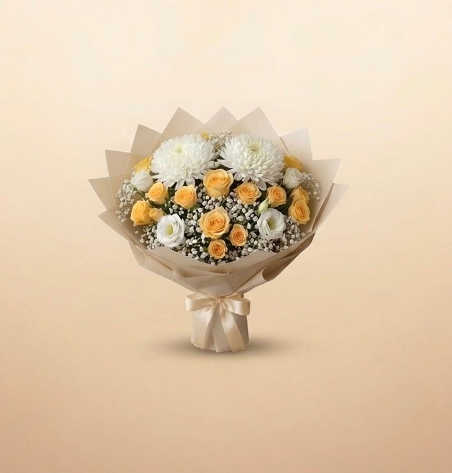 The Golden Hour Bouquet captures the warmth of late afternoon light in floral form — yellow spray roses, full white chrysanthemums, white lisianthus and feathery gypsophila, arranged together in our natural linen-toned wrap and tied with a champagne satin ribbon. This is a bouquet of gentle optimism and warmth — the kind you give to someone you genuinely want to make smile. Its soft golden palette works beautifully for birthdays, congratulations, new beginnings or as a standing weekly arrangement for your home or office. Prepared fresh to order at V60 Bloom, Jumeirah.