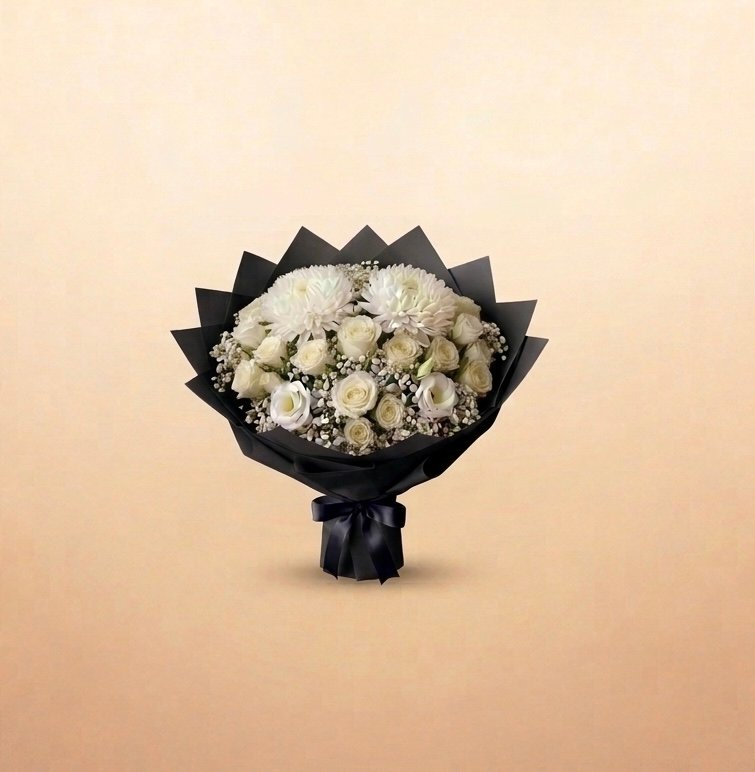 The Noir Blanc Bouquet is V60 Bloom’s most visually arresting mixed arrangement — a generous gathering of white spray roses, full white chrysanthemums, lisianthus and delicate gypsophila, presented in matte black wrapping with a black satin bow. The contrast between pure white blooms and dark packaging creates a composition of rare sophistication and dramatic beauty. A bouquet that makes a statement without saying a word — equally suited to a bold romantic gesture, a luxury corporate gift, or a deeply personal moment of appreciation. Prepared fresh to order at V60 Bloom, Jumeirah.