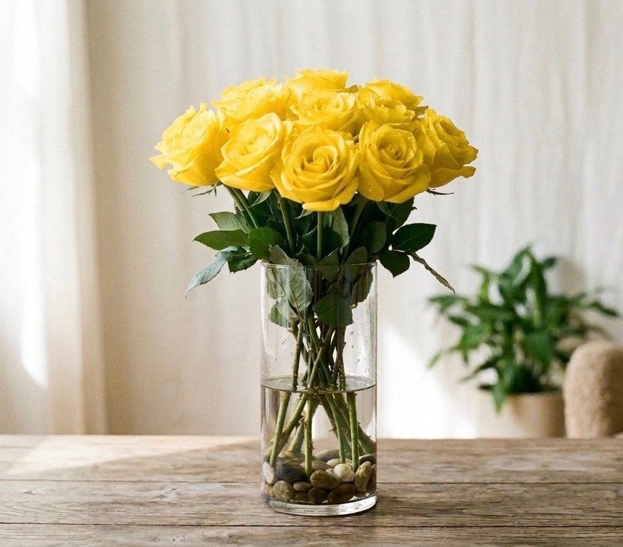 The Solar Vase is the most uplifting arrangement in the V60 Bloom collection — a generous gathering of bright, sun-yellow roses, each bloom at its most vivid and joyful, arranged in a clear glass cylinder vase with a natural pebble base. Yellow roses are the universal symbol of friendship, happiness, and the pleasure of a new beginning, making this arrangement an ideal gift for birthdays, achievements, new homes or any moment that deserves to be celebrated with genuine warmth and good feeling. The clear vase allows the full beauty of the long stems to be appreciated. Ready to display immediately.