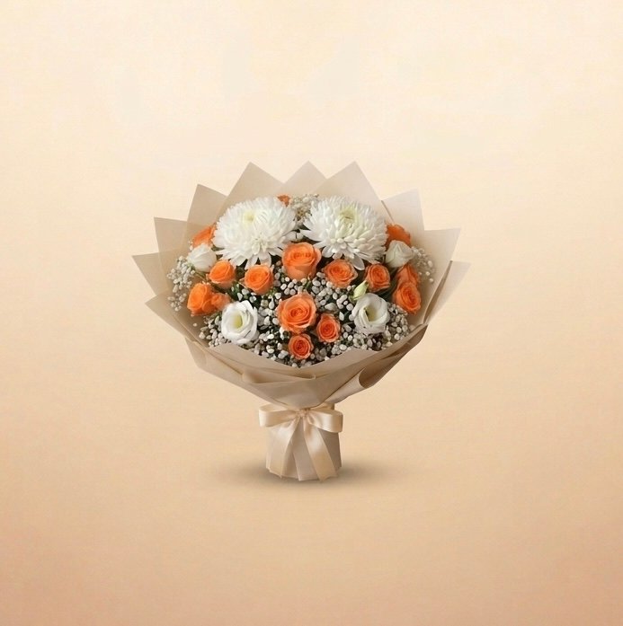 The Tangerine Bouquet brings an irresistible burst of warm, vivid colour to any space it enters — bright orange spray roses, full white chrysanthemums, white lisianthus and airy gypsophila, arranged together in our natural cream wrap and tied with a champagne satin bow. Orange blooms carry the spirit of enthusiasm, creativity and the pleasure of the unexpected — making this arrangement an ideal birthday gift, a thank you with real impact, or a joyful addition to any home or workspace. Prepared fresh to order at V60 Bloom, Jumeirah.