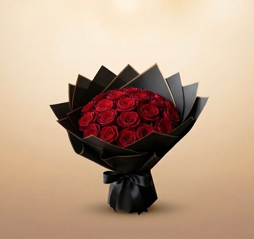 The Velvet Midnight Bouquet is V60 Bloom’s most dramatic creation — a generous arrangement of deep, velvety crimson roses presented in striking matte black wrapping, finished with a black satin bow. This is a bouquet that makes a statement before a single word is spoken — bold, confident and deeply romantic. The contrast of dark red blooms against black paper creates a composition of rare visual intensity and luxurious beauty. Reserved for the occasions that demand something truly unforgettable. Prepared fresh to order at V60 Bloom, Jumeirah.
